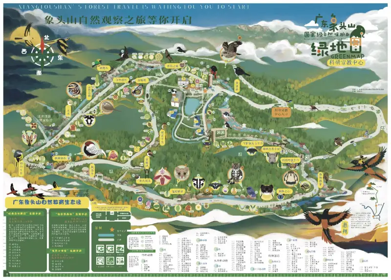 2021年4月-2021年12月,绿色营与广东象头山国家级自然保护区合作开展的绿地图项目顺利完成。绿色营基于象头山保护区三堆池宣教中心,经过多次考察与沟通,为保护区绘制了绿地图,并开发设计了一套专用的视觉识别系统图标,完成后的绿地图已悬挂于保护区宣教中心并印刷折页用于保护区的科普宣传。