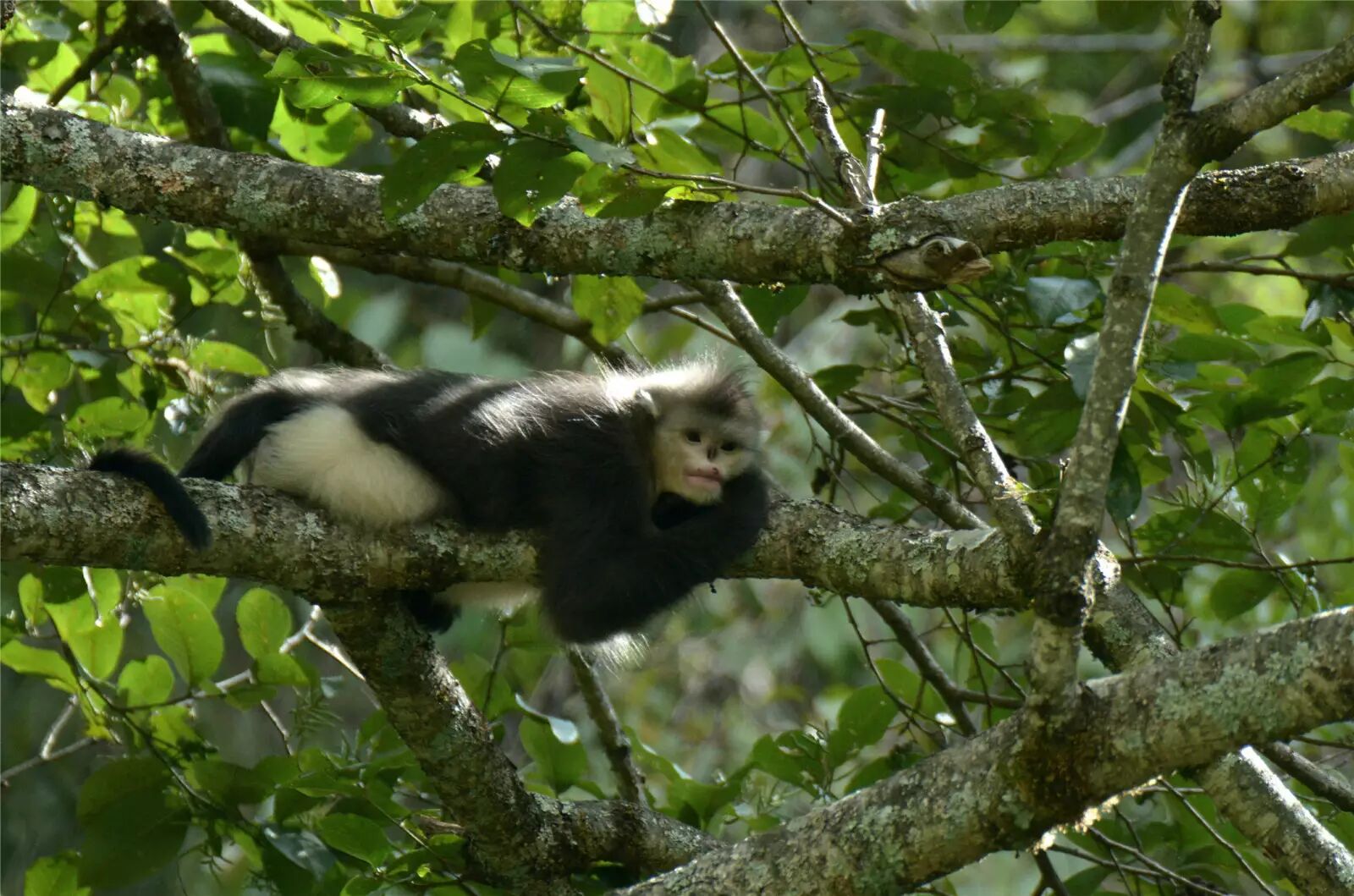 9月27日上午九点,在龙勇诚老师、钟泰局长的带领下,全体营员进入保护区七号观测点探访生活在这里的滇金丝猴们。每天上午九点,是给滇金丝猴喂食的时间,随着护林员吹响哨子,把一大袋松萝投向茂密的林间,只见树枝摆动,滇金丝猴出现了,或争食,或小憩,或跳跃玩耍,在浓密的枝叶间若隐若现。