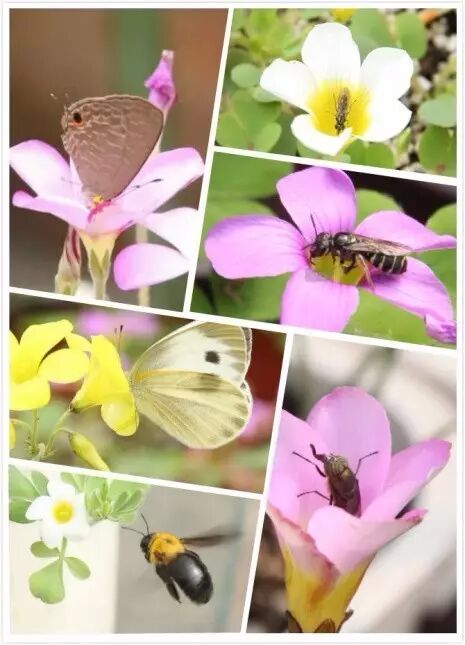 这些都是酢浆草,它们的花是开放式的,吸引了包括蜜蜂、蝇类、蝴蝶之内的各种访花昆虫。