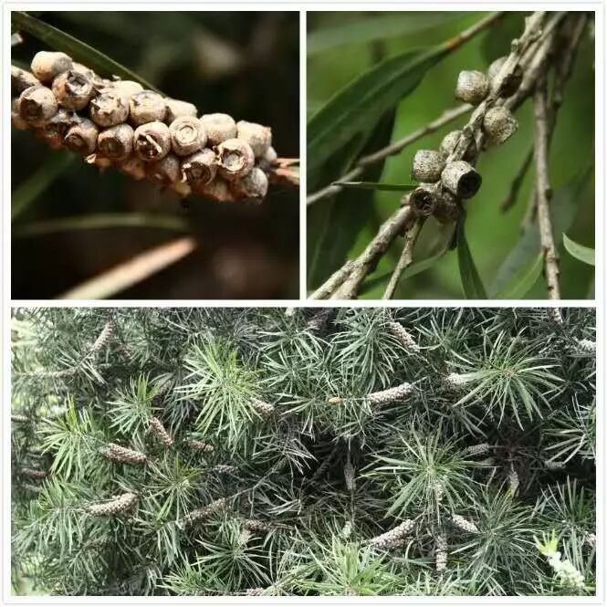 红千层的果实是蒴果,蒴果的特点是会开裂。右上角是我在杭州见到的,比较小,但是已经开裂过了。左上角和下边是在成都见到的,它们都比较大,但是没有开裂。红千层的种子常常会在树干上呆很多年,只在一定条件下它才会裂开释放种子,比如说火灾。有些类似的植物在亲本死后才会裂开释放种子。