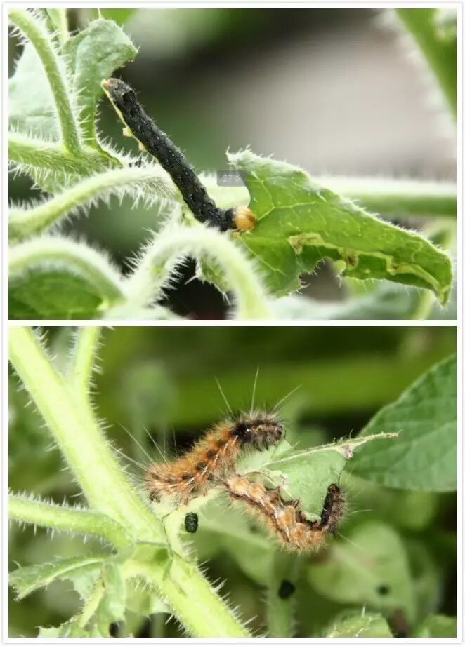 琉璃苣的茎上跟它的叶子上都有一些刺毛,这种刺毛通常用来防止被昆虫取食。然而我的琉璃苣生了3种虫,上边比较明显的是一条夜蛾的幼虫,然后右手往右一点,叶子上网络状的是潜叶蝇造成的,底下是两条灯蛾。它们对我的琉璃苣的破坏蛮大的,我也没打虫,直接把琉璃苣砍掉了。所以说植物的很多的抗性是相对性的,所谓道高一尺魔高一丈,总有一个东西要去克掉你的这个看家本事。