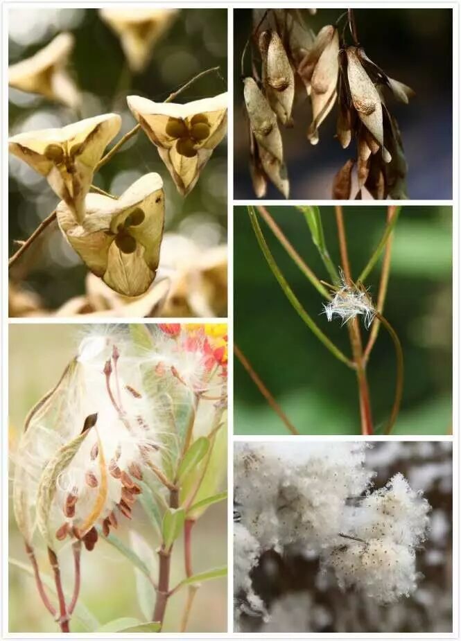 左上是栾树,右上是臭椿,右中是柳兰,柳兰种子的传播能力还是很强大的,在很多地方柳兰已经成为入侵植物。左下角是马利筋,样子和蒲公英类似,右下角是野棉花。
