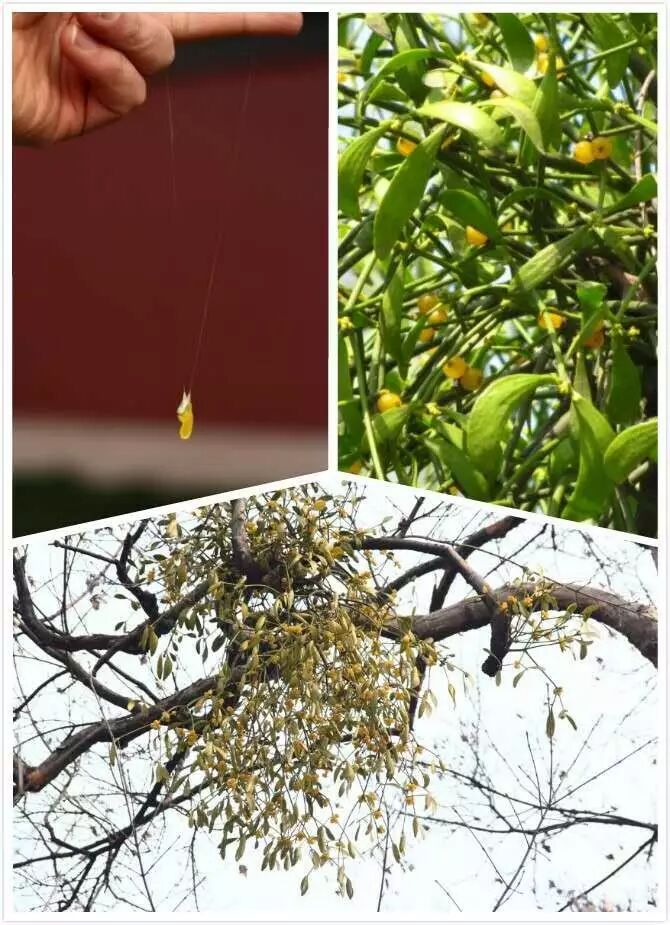 槲寄生是靠鸟类来传播种子的。它的果实有一些特别黏的物质,鸟会帮它把果实给蹭到其它枝条上,它就会萌发。但它套路太深,许多鸟上当之后就不会再碰它,所以到了4月份一些果实还会挂在枝头上(右上角)。但不得不说,它的这一锤子买卖还是成功的。