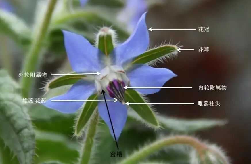 典型的花有四个部分,一个是花萼,一个是花瓣,再就是雄蕊和雌蕊。琉璃苣的花在蓝色的花瓣跟雄蕊之间有两轮附属物,靠近花瓣这一轮,白色的比较短,靠近雄蕊,基本跟雄蕊贴在一起的,带有紫红色的蓝色。两轮附属物间是沟槽,这个沟槽是琉璃苣产生花蜜的地方。它的内轮附属物把它的雄蕊给束到一起去了。