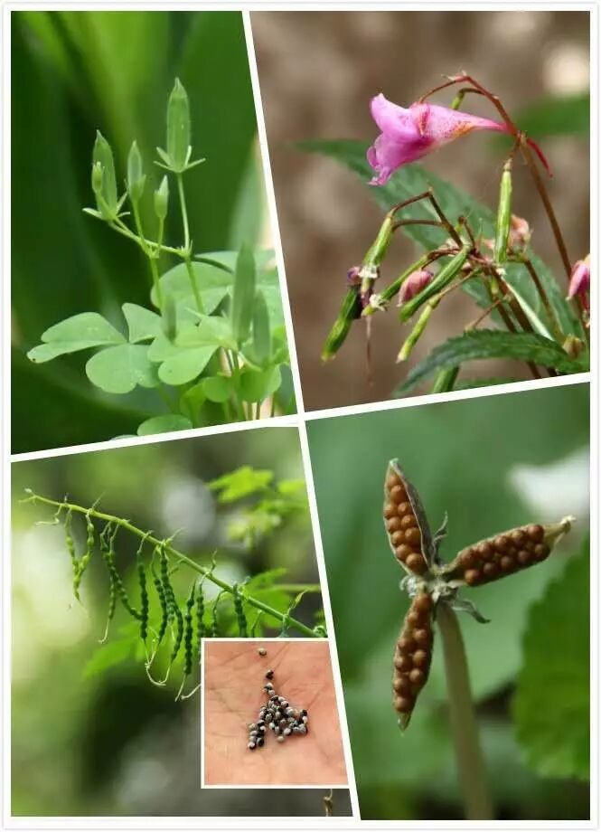 这张图片上的植物靠弹射来传播种子。左上是酢浆草,右上是滇水金凤,左下为黄堇,右下是堇菜。 黄堇的种子外面也有一层白色的东西,它也是一种蚁运植物,它的弹射能力比较有限,所以加上蚁运来双重传播种子。