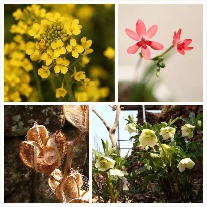 以上四图:油菜、小苍兰属植物、铁筷子、荞麦叶大百合(顺时针)