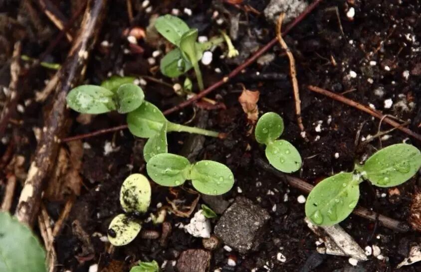 这是琉璃苣种子萌发之后子叶的样子。琉璃苣播种很简单,就是刨个坑,撒种子,埋个土,数个12345,盖好,浇点水,过个五六天左右就会发芽。两片子叶长出来是双子叶植物典型的样子。