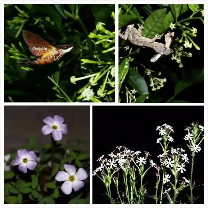 也有一些植物选择在晚上开花,上边的夜香树是房东种的,刚刚开过一拨,吸引了很多蛾子来传粉。晚上开的植物通常会有很浓郁的香味,壁虎会被吸引过去捕食蛾子。下面的植物是夜香酢和 “午夜糖果”福禄考,都是晚上开花而且香味比较重。