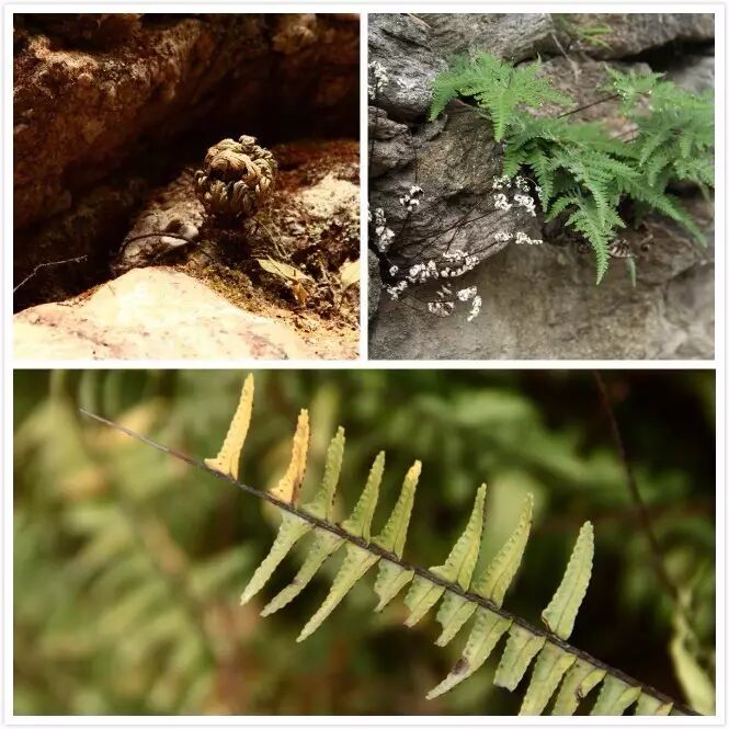这是三种蕨类植物,左上角是卷柏,右上角是粉背蕨,底下是四川跟云南都种的特别多的园林上用的肾蕨。