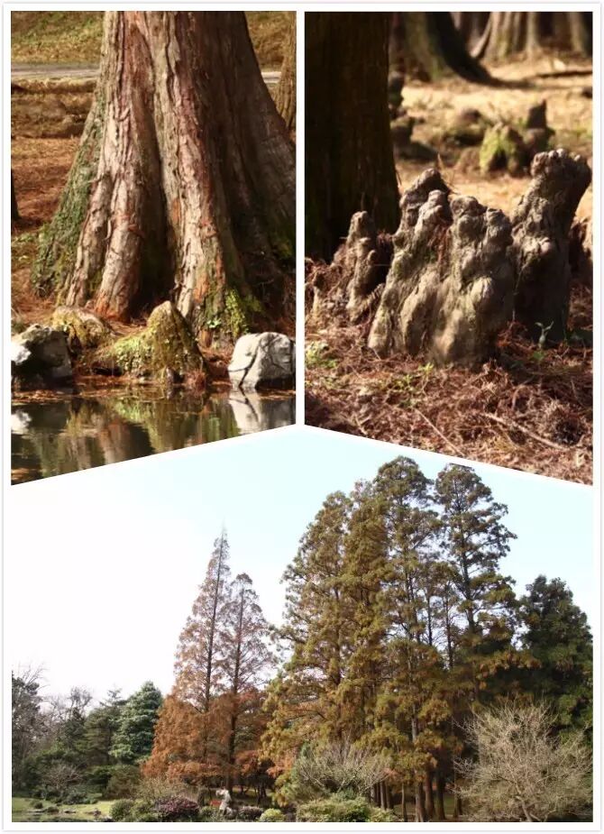 水杉就没有这样的结构,实际上水杉耐湿涝的能力也会比这两个低。孙筱祥院士后来来杭州植物园参观的时候对这个景点提出了些修改意见,他说把水塘扩大,直接把把岸边的这几棵裸子植物圈到水里面去,这样更能体现它的原生态。