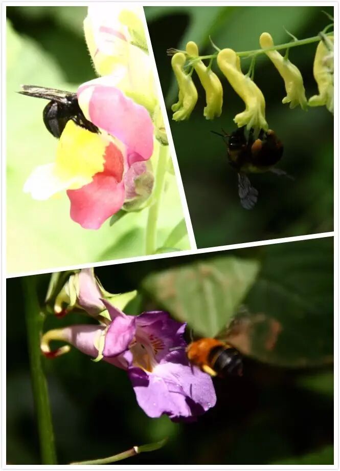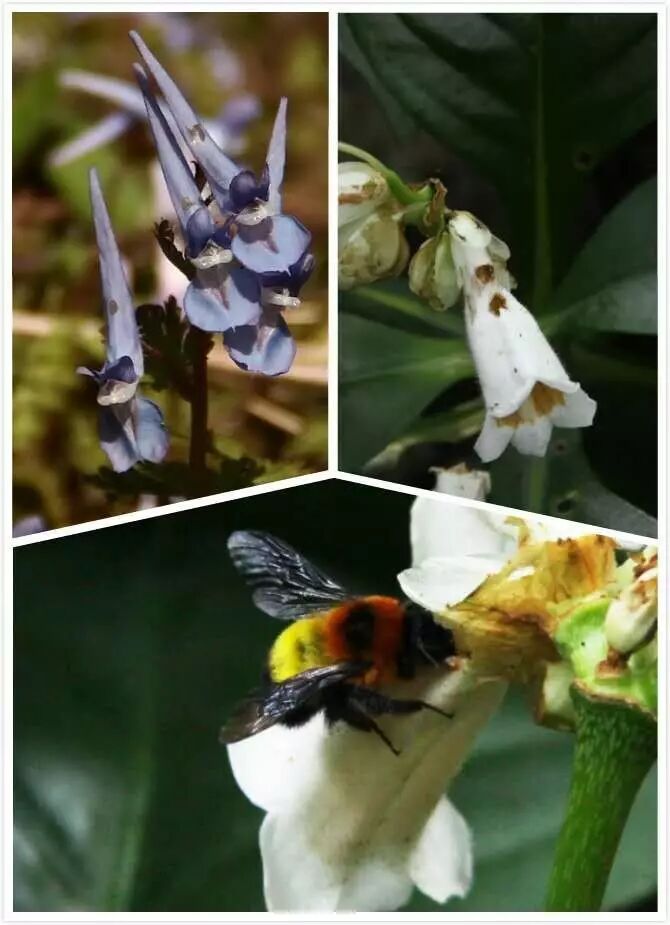 我们再看三种呈管状的花,左上角这是金鱼花,它的开口平时是被堵起来的,熊蜂要想获得里面的花蜜要自己拱进去。右上角的是黄堇,紫堇属植物,紫堇属植物在中国分布非常广泛。下边的是凤仙,凤仙虽然几个花瓣没有合生成一个管,但是它的几个花瓣的排列形状形成了一个管,这时候比较大的熊蜂更适合给它传粉,蜜蜂相对少些。