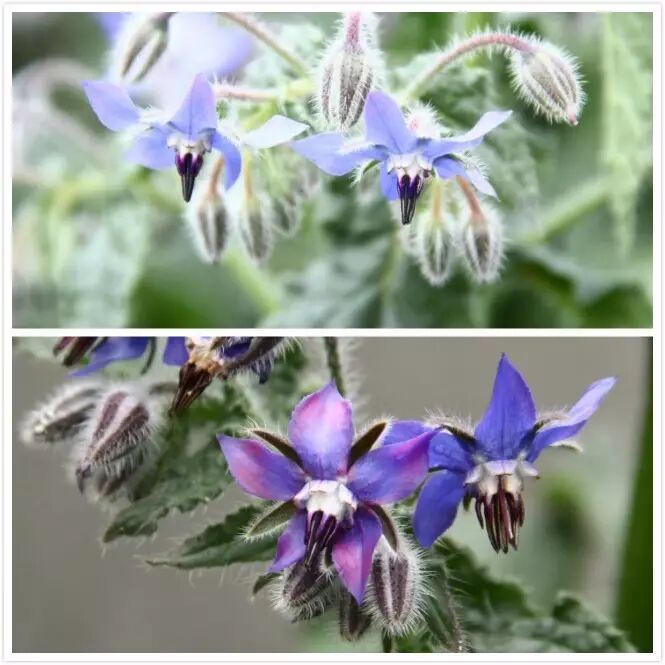 这个是琉璃苣的花,国外叫他Starflower:星花。它的花苞是粉色的,花刚开放的时候也是带一点粉色,然后慢慢的粉色会褪去,最后变成蓝色。我们经常能够见到一些花的颜色会变化的植物,比如金银花,它刚刚开放的时候是白色的,然后会变成黄色,当白色跟黄色都存在的时候就是一串金银。