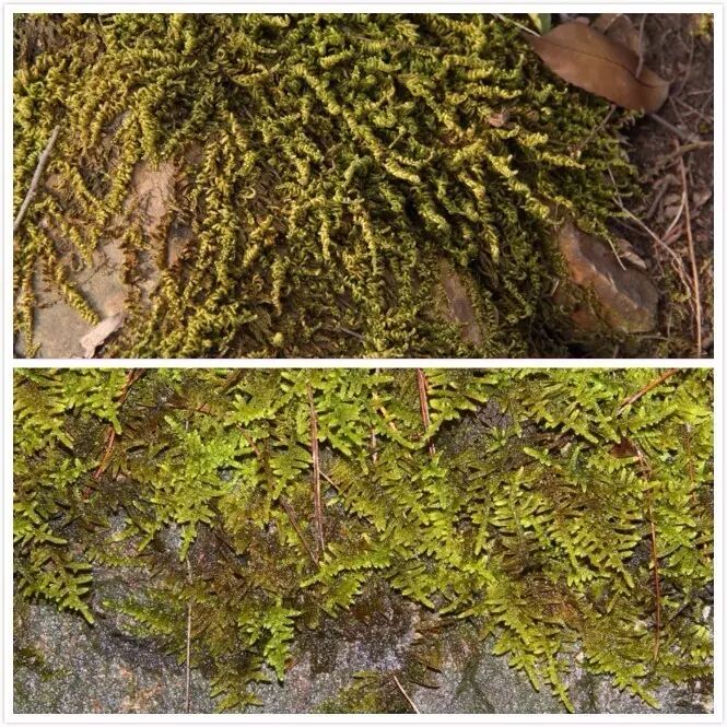 大家可能认为蕨类和苔藓都是离不开水的,对水分的需求量都特别大,而实际上,有许多蕨类和苔藓是非常抗旱的。这个是杭州非常多的大羽藓,它大多生长在山脊上,山体的石头上。大羽藓生长在石头表面,覆盖着石头生长,干旱的时候,它就会卷缩起叶子,等到下雨就会伸张开吸水。