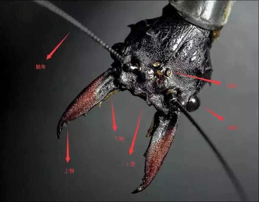 是一个巨齿蛉的头部,上面有着昆虫感觉和取食重要的器官,取食器官主要有上颚、下颚以及图上并不太看得出来的下唇,感觉器官主要有两类眼睛,复眼和背单眼,触角,上唇以及上颚、下颚、下唇上相连的一些与触角类似的结构。不过有时候一种功能的器官也会被征用,执行其他的功能,例如最近的报道,触角在一类化石甲虫中可以起到辅助捕捉猎物的作用;还有一种天牛触角被发现拥有和蝎子毒针类似的结构,可以起到一定的防御作用,有蛰伏的能力,能引起一定程度的红肿。这些器官除了眼睛都是有附肢构成的,也就是一类特化的足。