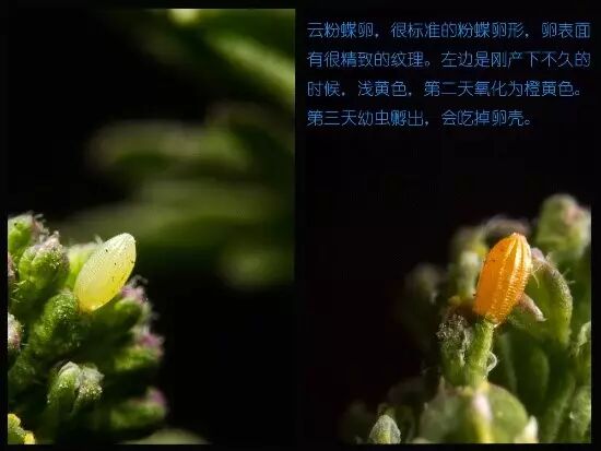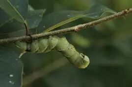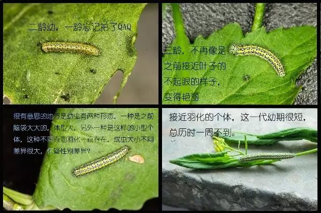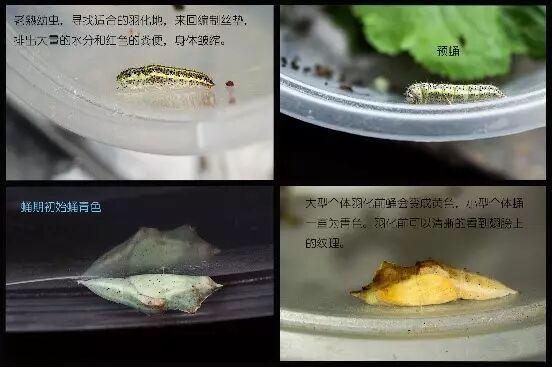 如图:成虫将卵产在叶子之间,期间幼虫在不断的吃东西,成虫了之后出来。