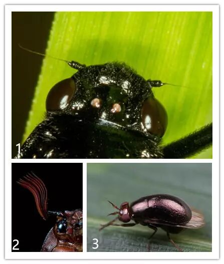 1、蝉类的触角呈刚毛状 2、金龟子的触角呈鳃片状 3、苍蝇的触角呈具芒状