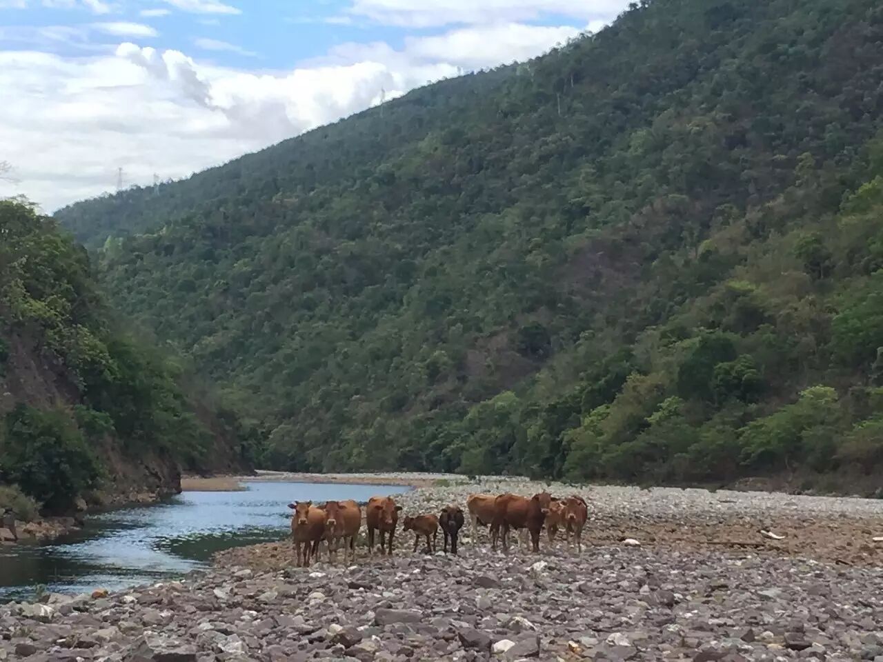 山坡上的树木茂密苍翠,据中国科学院西双版纳热带植物园的顾伯健老师介绍,这里生长着心叶木、余甘子、厚皮树、木棉等具有热带季雨林典型特征的树种。漂流艇停靠在河滩时,水边是成堆被河水打磨光滑的石头,再往上,是开阔的草甸,牛群在远处悠然地吃草,蒲公英的小伞轻轻飘飞。青草延伸到山下,错落分布着一些高大粗壮的树木。这里,本该是绿孔雀觅食、求偶的最佳场所。