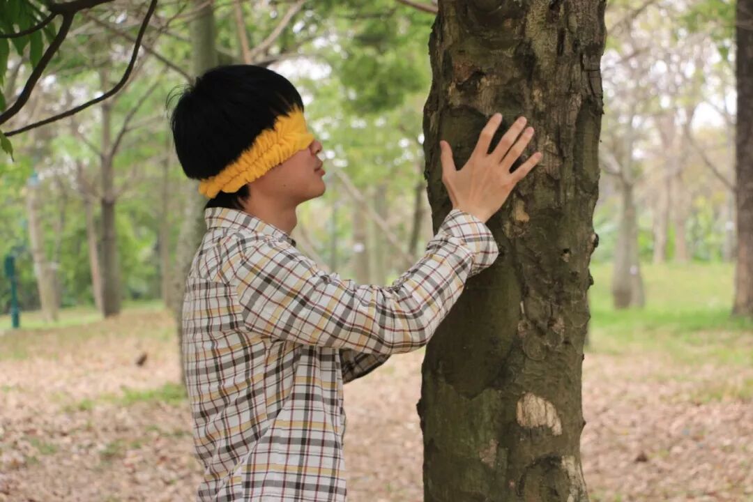 感受脚下地面、坡度的变化,聆听周边小伙伴声音的远近,细嗅不同位置空气里的芬芳。经过树木时,仔细触摸它的树干和枝桠,当建立起与所触摸的树的连接,摘下眼罩,就可以自信地指着它说:“这就是我的那棵树!”