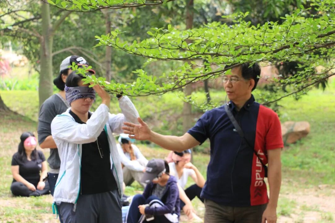 回到教室收拾好随身物品,又回到了那片小叶榄仁林下。没错,又到了玩游戏的时间。这是个综合性的感官游戏,参与者蒙着眼睛,一人引导着他前行,蒙着眼的同学要充分开动视觉以外的感官,体悟走过的路线,并将它复现出来。