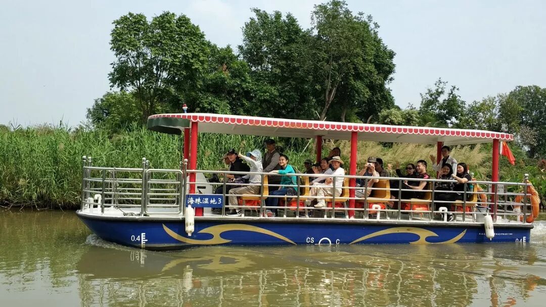 中午,在员工食堂“野餐”后,我们有幸能够乘船游览湿地内部。游船缓缓划开水面,微风扬起头发,两岸水草尽收眼底,与岸上远眺的景致确实大为不同,有位学员不禁唱起了“蒹葭苍苍,白露为霜,所谓伊人,在水一方⋯⋯”,歌声悠扬,倒是添了几分诗情画意。