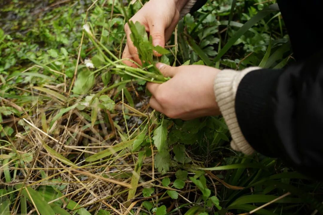 在观察结束返回营地的路上,老师还给我们介绍了一种在小溪里的植物——“水芹菜”。这是一种可以食用的野菜,老师建议我们可以采摘回去为我们的午餐加一道菜,于是我们非常活跃的阿鸡和合欢同学就马上行动起来,采摘了一大把“水芹菜”。在采摘水芹菜的过程中,老师发现了旁边有一种与水芹菜相似的植物“毛茛”,与可食用的水芹菜不同,毛茛可是一种有毒的植物。在小溪边,老师又为我们上了一堂“植物学”课,所以,大家以后在没有专业认识的指导下,可千万不要乱摘野菜吃哦。
