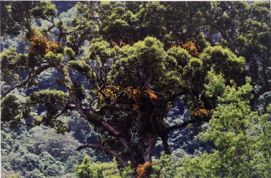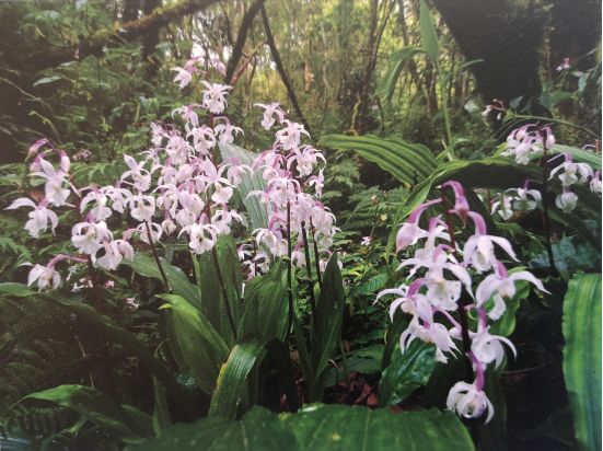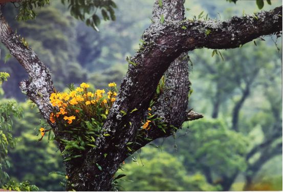 又有一次,拍金草兰。这是一种非常亮丽的台湾野生兰,1991~1993年我在思源垭口进行自然观察与记录时,就发现它的魅力。但它都长在大乔木树干上,很难表现野性亮丽之美,除非爬上树去。但这些大树多长在我无法立足、难以到达的陡坡或悬崖旁,我一直没拍到金草兰的好照片。