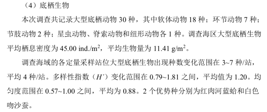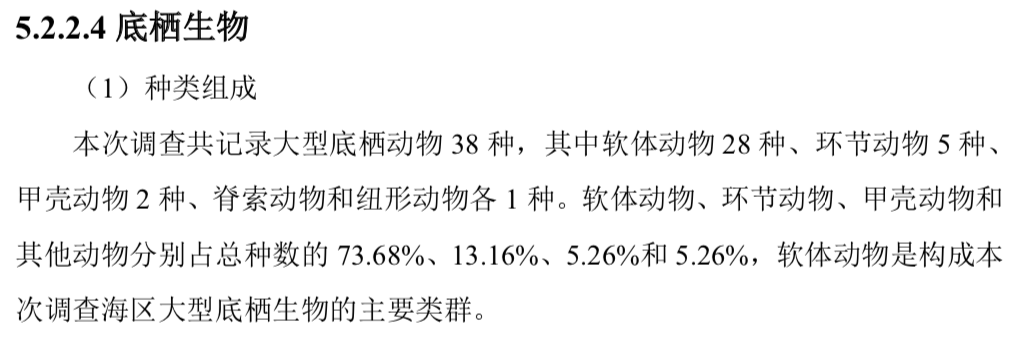 本报告的5.2.2.4和5.2.3.7中,都有关于底栖生物的描述,但数据前后矛盾,分别为38种和30种,具体描述也不一致。而依据《深圳湾底栖动物生态学》(蔡立哲,2015)一书,深圳湾共有大型底栖生物342种。鉴于深圳湾区域滨海生态系统较为均一,我们认为,环评单位对于底栖动物的调查工作并不充分,且前后数据不一致,侧面反映了环评机构业务能力混乱,其数据并未可信。