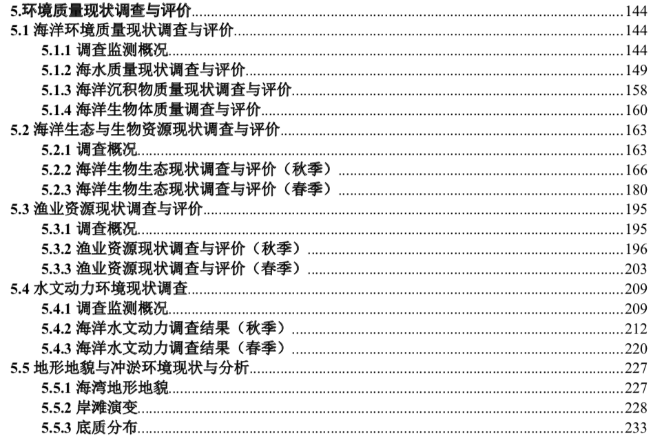 该评价书是依据《海洋工程环境影响评价技术导则》编写,第五章的内容是“环境质量现状调查与评价”,涵盖了海洋质量环境、海洋生态与生物资源(浮游生物、底栖生物、鱼类)、渔业资源现状(经济鱼类)、水文动力、地形地貌等方向。