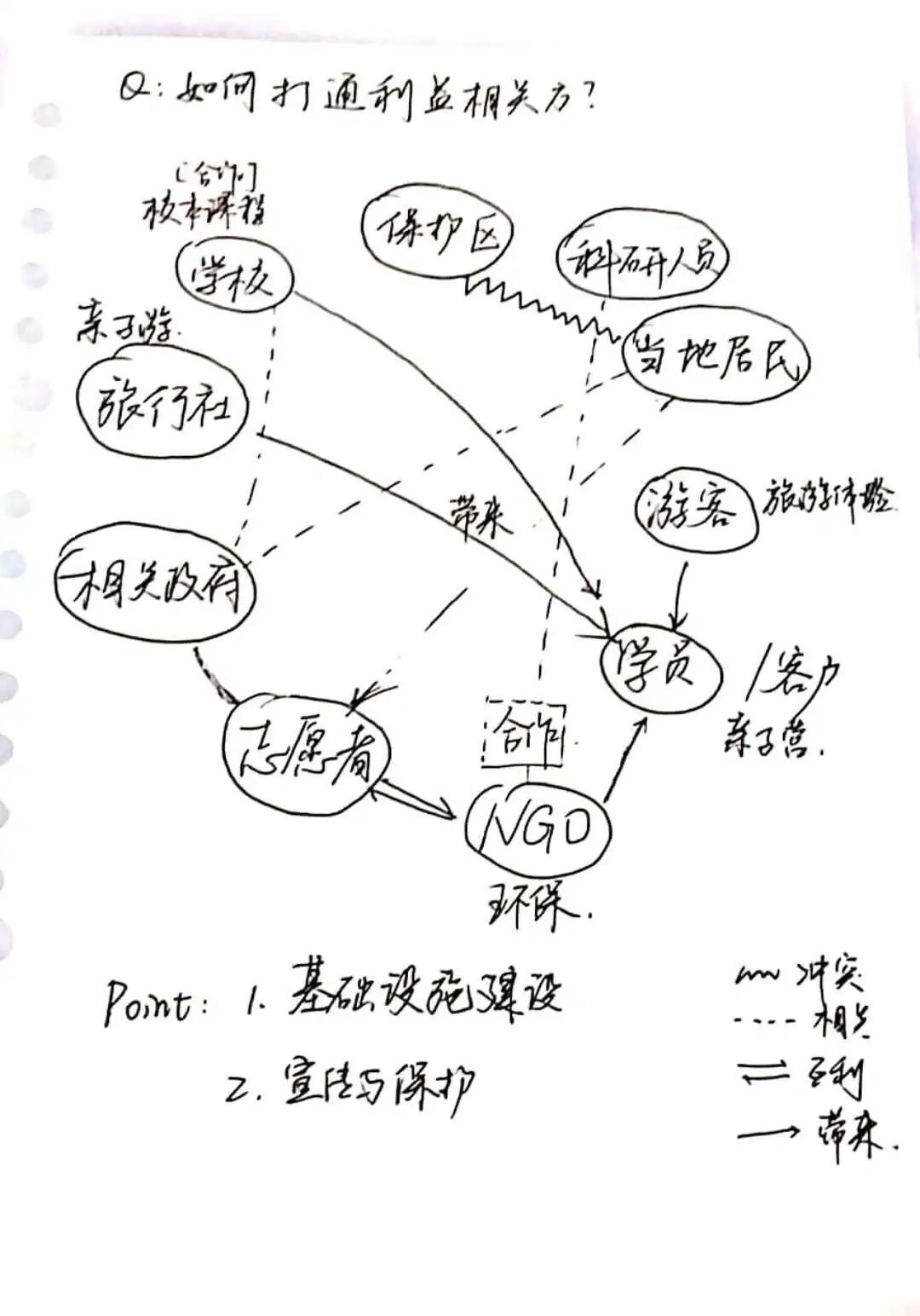 建设自然学校会涉及到保护区、学员、当地居民、科研人员、NGO、志愿者、相关政府、旅行社及当地学校这9个利益相关方,各有不同的利益需求。最终绘图中展示了各方利益关系,包括冲突、相关、互利、单向有利等。