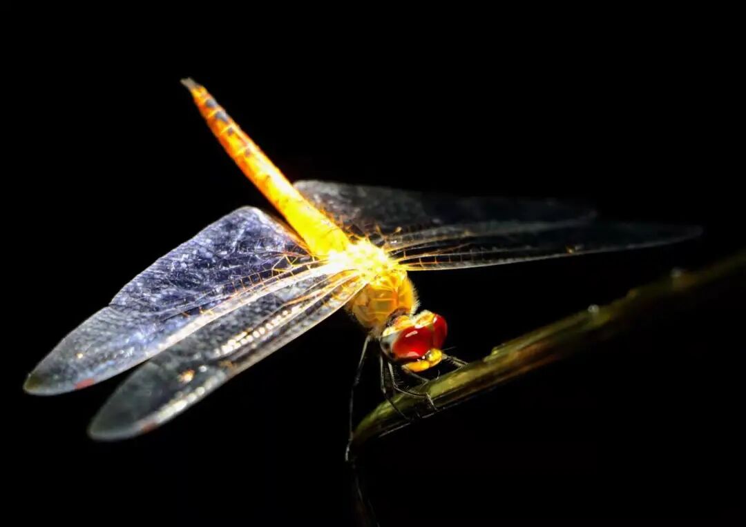 夜观时有只蜻蜓停在了手上。红宝石一样的眼睛,肚子上长了细小的绒毛。难以相信白天巡游在水面、在要下雨的草地上、在木栈道石头旁的它,只长了一双那么透明纤薄的翅膀。拍几张照片的时间,它就睡着了。正是观察的好机会,慢慢把它转了几个角度,甚至全部倒过来,它都一动不动。看样子这宇航员训练对于它来说是小菜一碟。