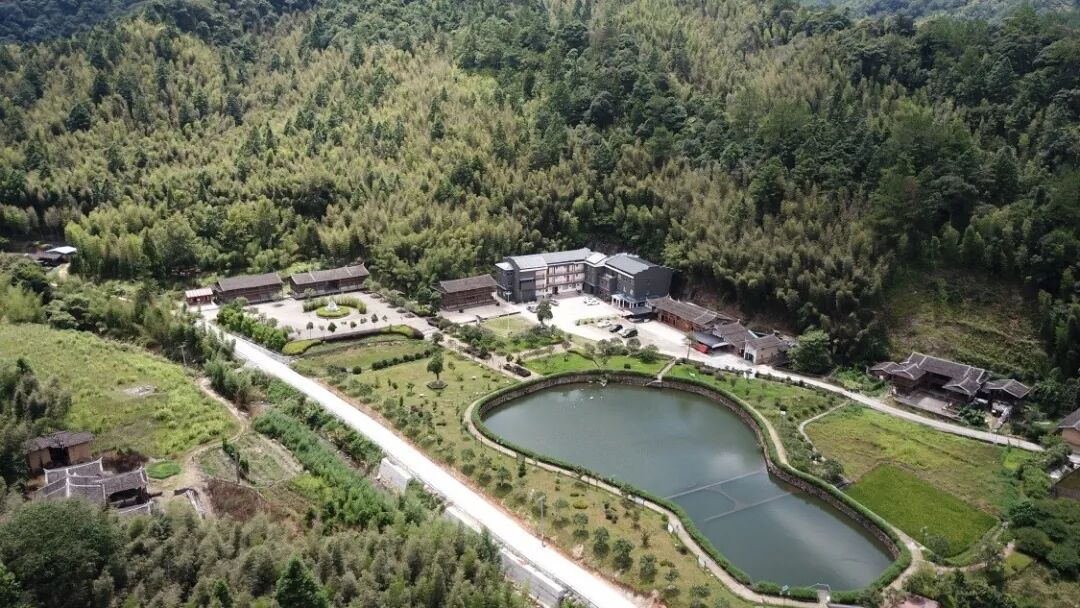 小桥连接着公路与土路,公路边有杉树和竹子;