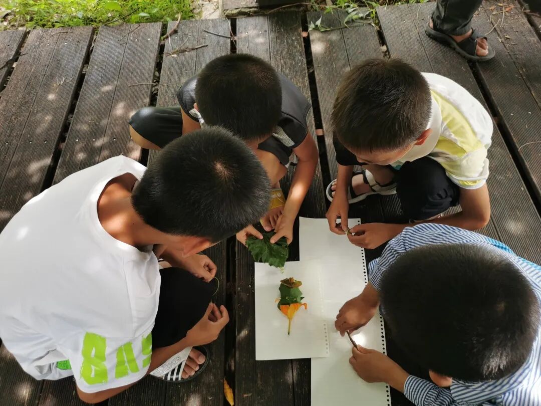 经过昨天及今早的实地考察,山的影子组设计了看见声音、五感体验和捡拾自然物制作自然脸谱的环节。