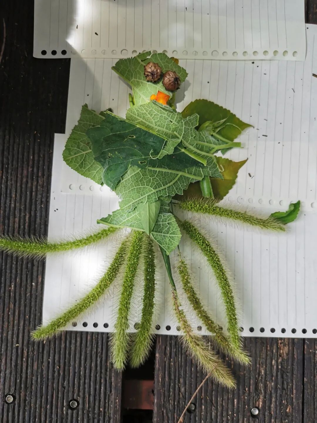 最后组员们和小朋友们一起在紫藤廊附近收集树叶、花朵、果实和草,发挥集体的想象力,摆在纸上,同时循环利用这些叶子,拿回去做蓝晒。