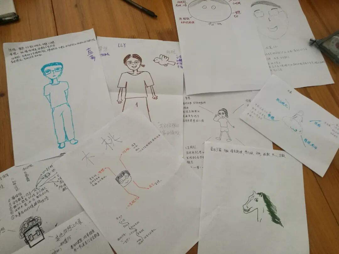大家贡献的思考越来越多,盐粒的纸也写得越来越密,这还不算上石斛和大头构思的“宣传运营”图。讨论过程中,云朵对草坪寻宝游戏提出想法,其他八个人瞬间鸦雀无声。直到云朵说完她的新构思,无一人打断。盐粒头一天把我们的讨论过程记在纸上,结果第二天木桃就整理出了电子版。我们后来就照着这个电子版绘制最终的思维导图。