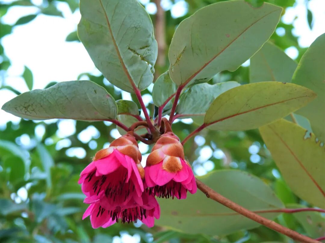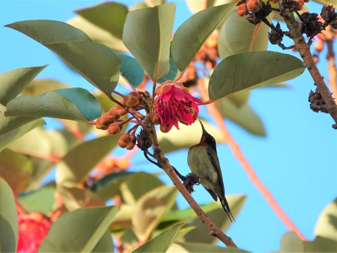 在象头山,山茶科的木荷和金缕梅科的红花荷都是当地的优势树种。前者早已进入果期,后者正在花期。红花荷叶腋生花,花柄反折朝下,每朵花的五簇雄蕊与花瓣齐高,同为鲜艳的红色,盛开的花朵簇拥在一起,仿佛坠在绿叶间的许多风铃。就有叉尾太阳鸟和暗绿绣眼鸟时不时地飞过来采蜜,同时也帮花儿们授粉。上到海拔更高处,我还在红花荷的花丛中看到了橙腹叶鹎和栗背短脚鹎。红花荷的花对鸟儿的吸引力可见一斑。