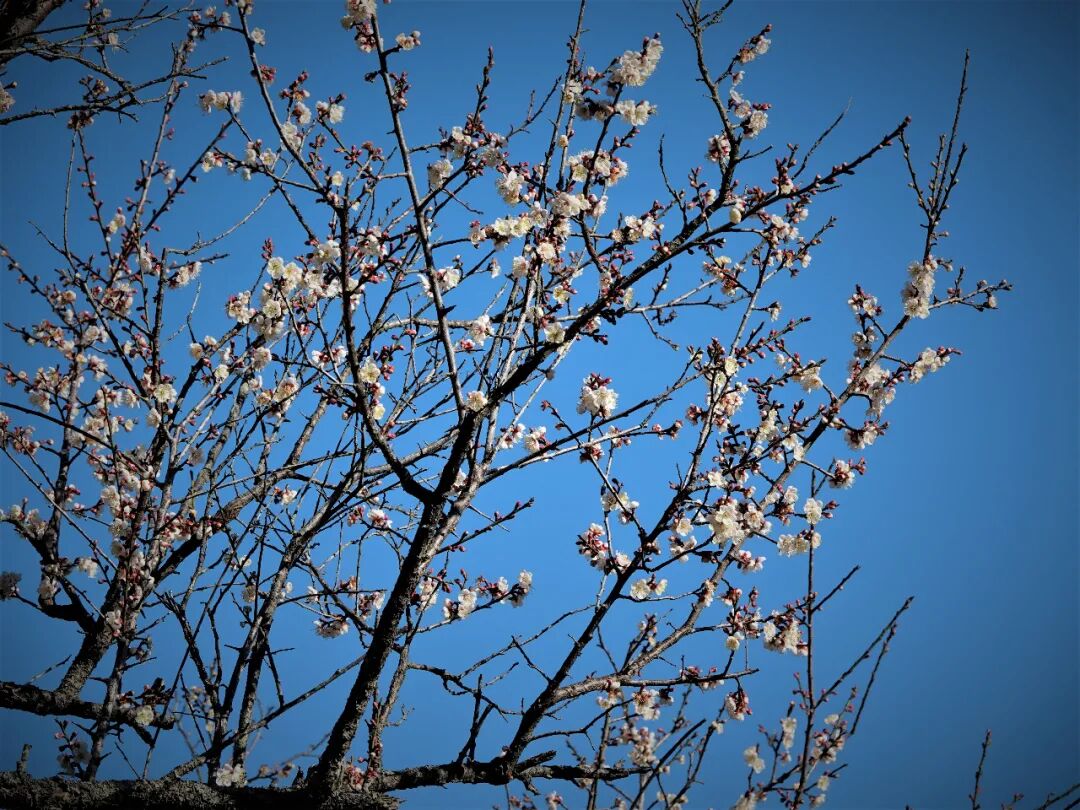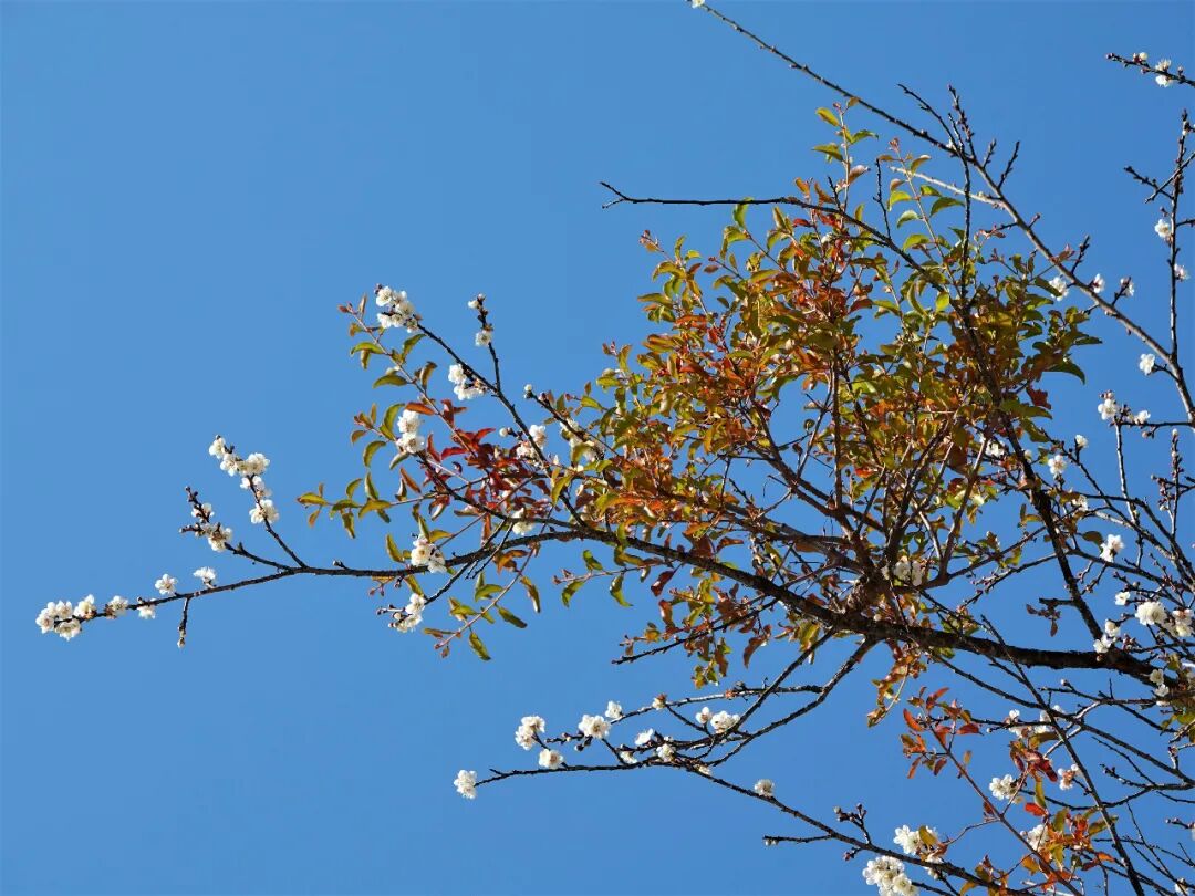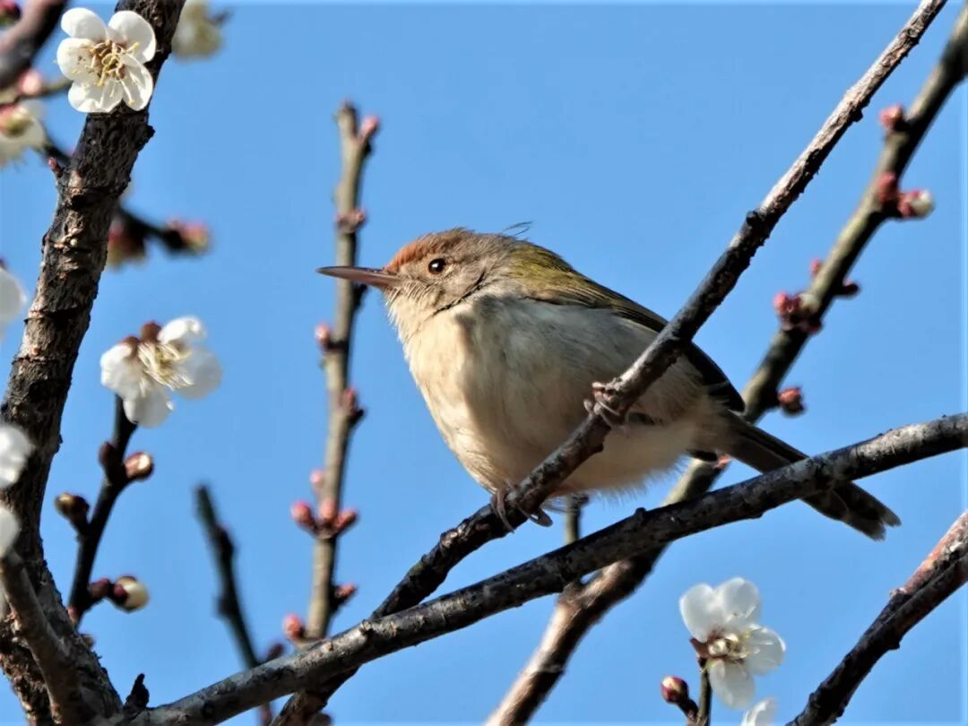 快到宣教处门口,当桥边一树梅花映入眼帘时,你才会觉得诗人张谓写的《早梅》“一树寒梅白玉条,迥临村路傍溪桥”有多么贴切。抬眼望去,蓝天丽日映衬着似雪的白梅,煞是好看。仔细一看,你会发现在梅花光秃秃的树枝上竟然长着几丛和这个时节不相称的叶子。我借助望远镜观察,还发现,每一丛叶子的枝条与梅枝连接处都有膨大,这难道是另外一种植物长在了梅树枝上?那它是谁?它又是怎么爬到那么高的梅树上去的?在我观察和拍摄期间,还有擅用植物的茎把树叶缝起来筑巢的长尾缝叶莺来光顾了梅花树。这让我忽然想到,难道是鸟儿们的帮忙才让那一丛丛叶子登上了巨人的肩膀?
