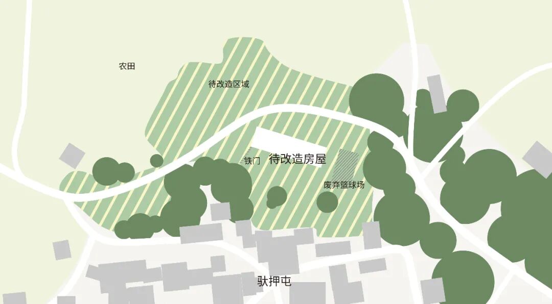 项目地块原来为一所乡村学校教学点,由一栋单体建筑和独立院落、篮球场与若干农田、竹林等组成,占地面积约0.2公顷。