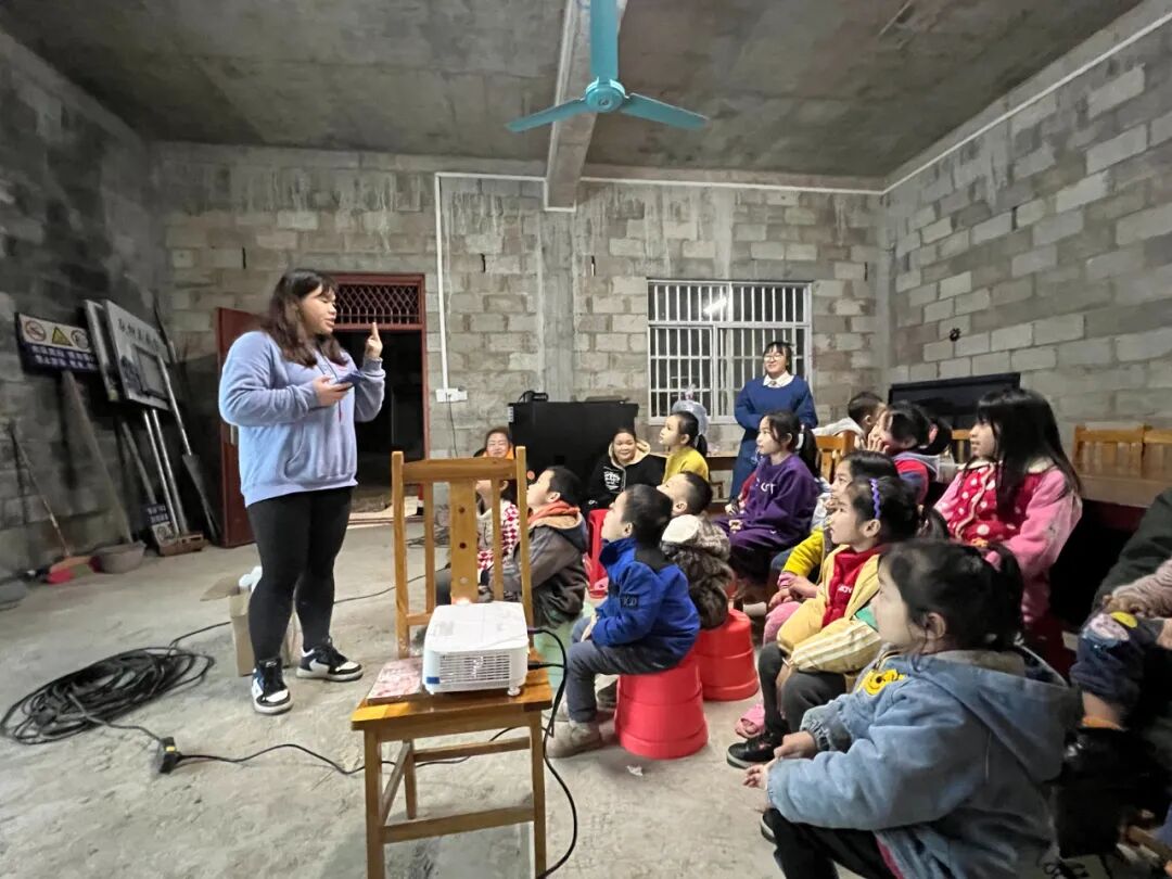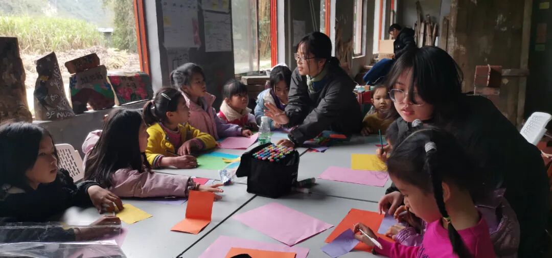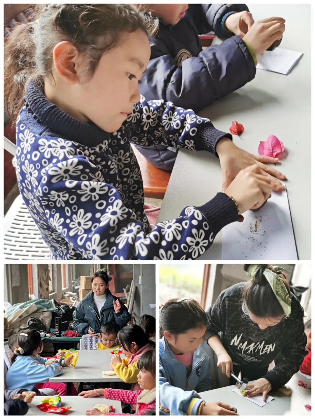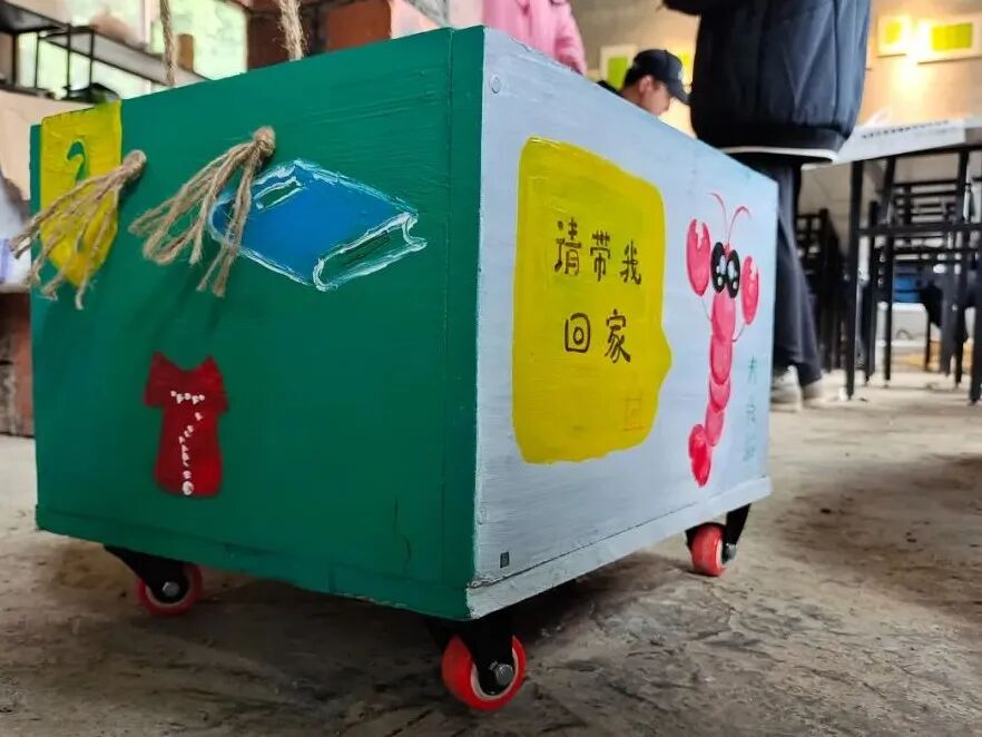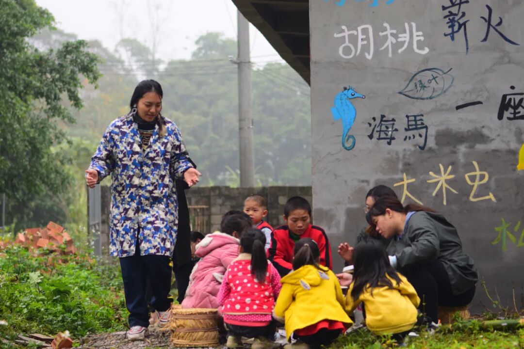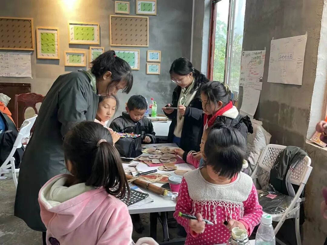 在这个垃圾桶制作环节中,小组成员带领村中小朋友积极参与。