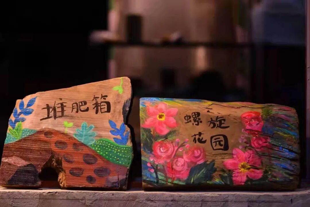 2 完成部分室外展牌的制作:科普展厅门牌设计与制作【鸟咔咔的故事】;【螺旋花园】、【竹乐-请敲敲吧】、【堆肥箱】、【水果之森】等十个标牌设计与制作。