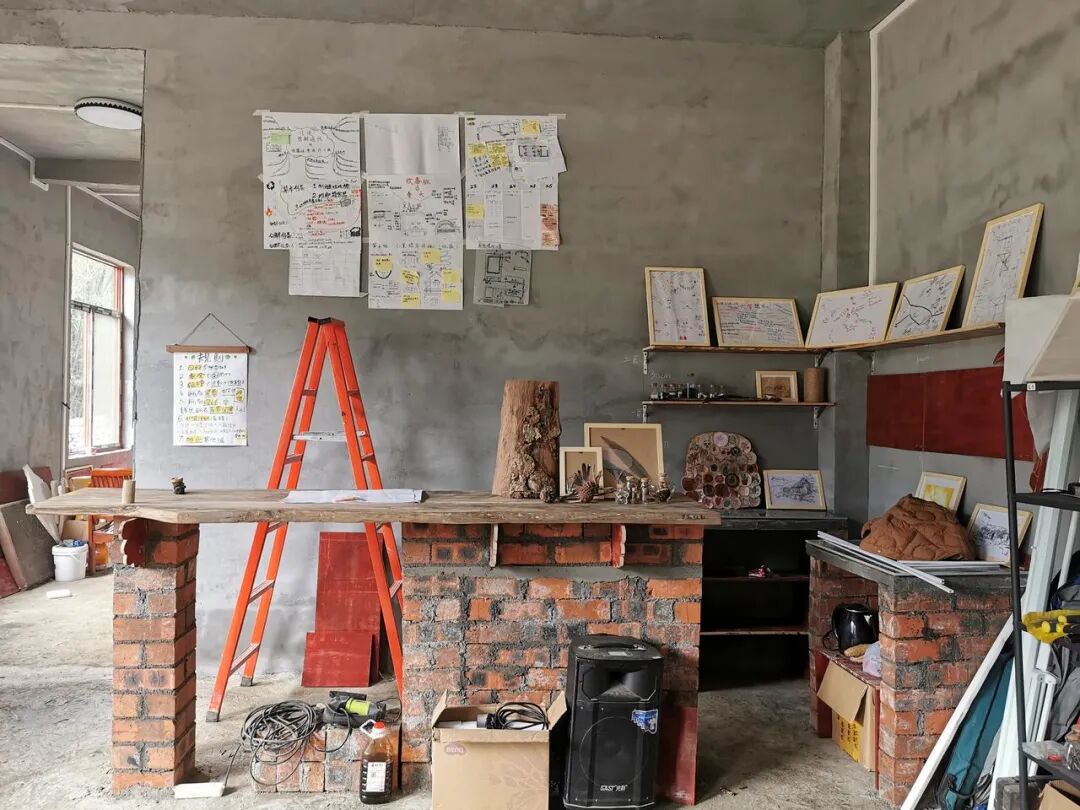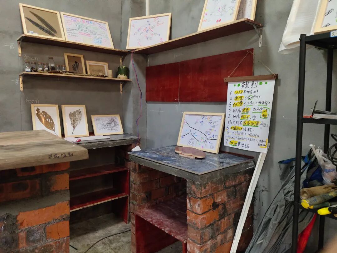 1 科普展示区的功能。增加多功能展示区,使得该空间具备横向展示自然物、吧台休息等功能。最终在食育小组的全程组织下,与驮押屯多位村民叔叔完成了此区域的基础建设,可以投入使用。