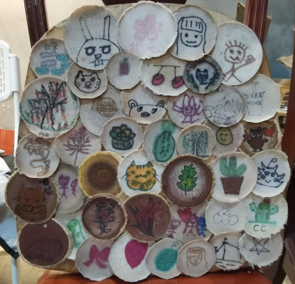 2 废物利用:收集村中木匠叔叔废弃的磨轮砂纸片,利用废弃的圆形砂纸片,制作自然名牌、杯垫、展品托等多功能小物件。
