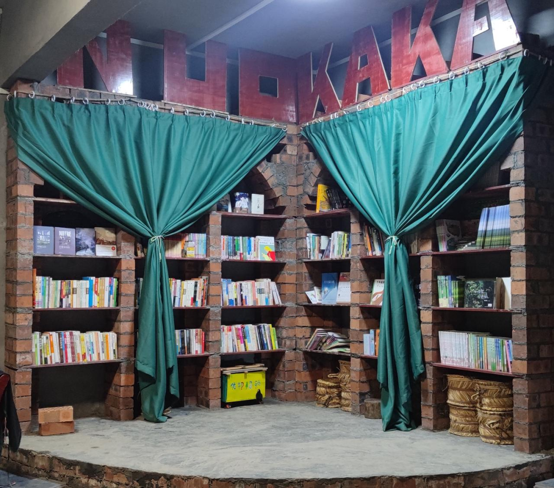 3 图书角的设计调整。在原本设计中,我们以红砖和红板材料的现有结合,构成图书角的基础设施,在本次营中与驮押屯施工师傅进行了技术的商讨,最后做出了结构的调整,将方正的造型调为拱形的顶,并切割红板制作“NUOKAKA”的名称拼音牌。