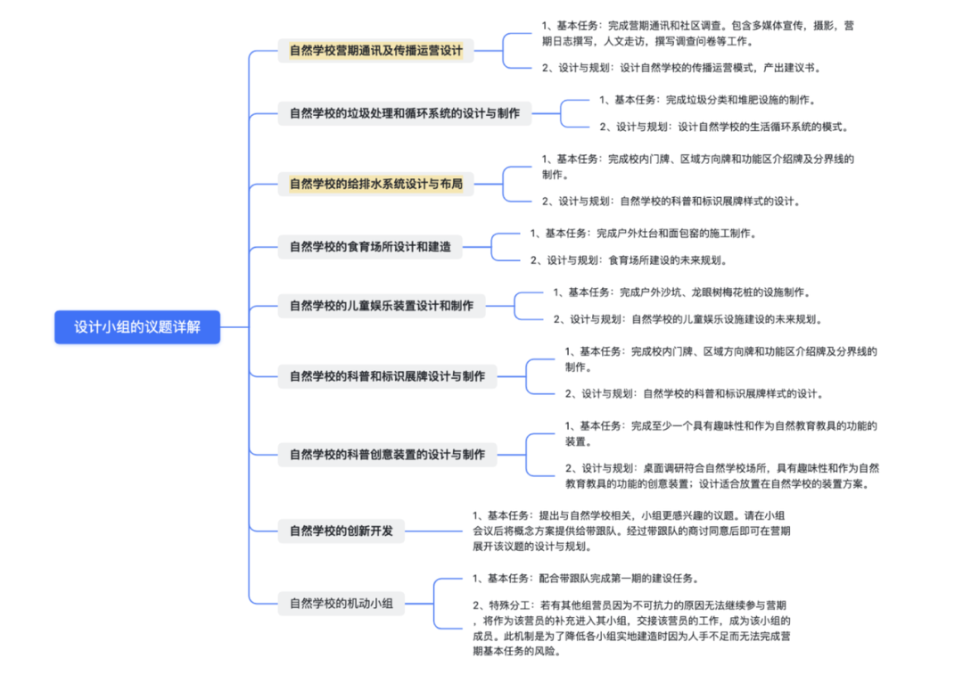 任务目标:收集与自然学校相关,小组更感兴趣的议题。于小组会议后将概念方案提供给带跟队。经过带跟队的商讨同意后即可在营期展开该创新议题的设计与规划。