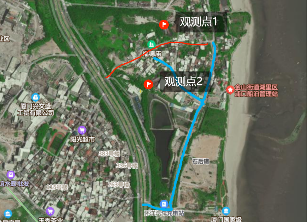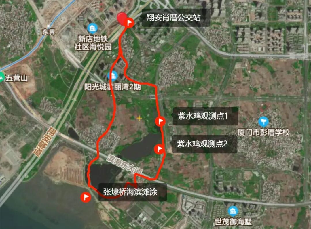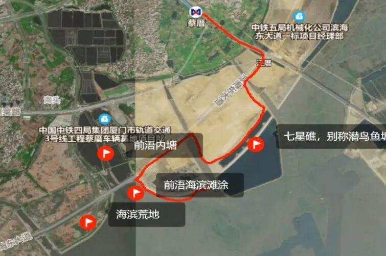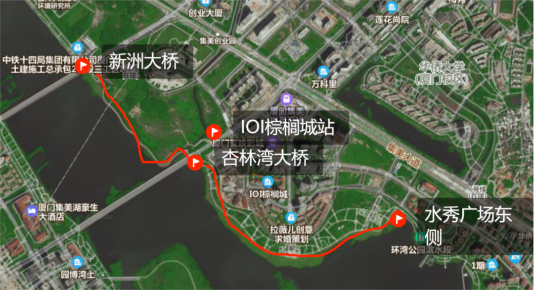 2021年冬季时,杏林湾大桥至水秀广场一线的草地上,有着诸多黄鹡鸰,理氏鹨和黄腹鹨也在此出没;2021年四月份时,水秀广场东侧的绿地也有硫磺鹀、北鹨和中华攀雀的纪录,图中红线画的路线都是观鸟路线,兼顾岸边草地和杏林湾水域,这便是杏林湾北岸的观鸟路线。
