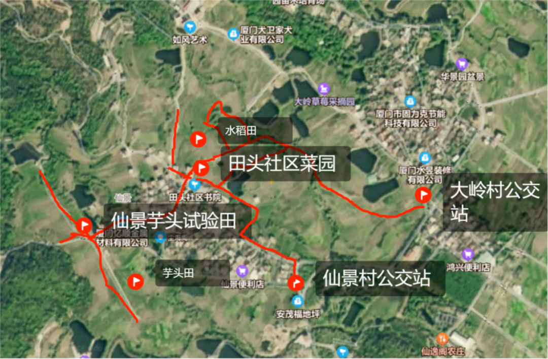 想要充分发掘田头的鸟类,就需要在农田的田埂上来回行走,观察周边的鸟类,切记不可踩踏村民的农田,这些农田里多种植芋头和水稻。示意图里的红线部分为大致的田埂路线,到了实地会更明显看到田埂,村人对外来的观鸟拍鸟人较为友善,有时也会上前闲聊攀谈,需要注意,不要踩踏这里的农田。