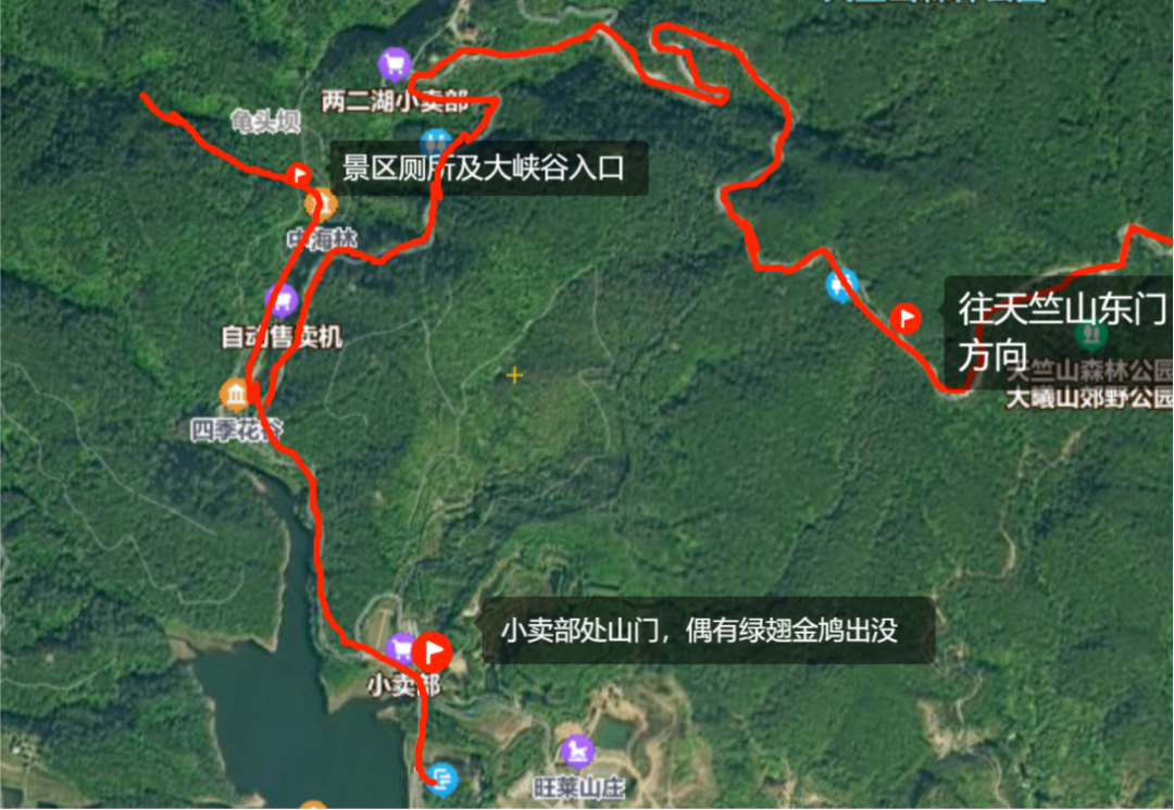 天竺山的观鸟热点区域主要是西门到大峡谷沿线,从天竺山西山门出发,走到图中小卖部处,可以留意附近的低矮山坡,偶尔会看到绿翅金鸠,随后可以继续前往四季花谷;四季花谷有一条溪流,沿着溪流往中海林方向穿行,跟着景区路牌便可一路找到大峡谷入口;进入大峡谷徒步路线后,会见到一个景区厕所,继续往前,会遇到金属外皮的水箱,这条路线为石板路、台阶路交错,可继续前进,但鸟况较好的区域仍在景区厕所附近200米的路线范围内。