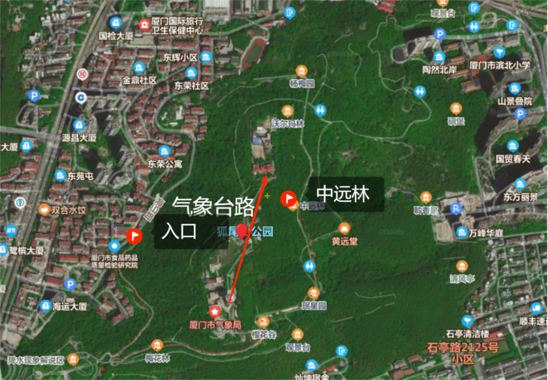 狐尾山公园的观鸟热点主要有气象台路和中远林,气象台路地势较高,常有猛禽出没,春季迁徙时亦有斑尾鹃鸠的纪录;中远林是一片神奇的小树林,迁徙季有各种鹟类出没,亦有蓝歌鸲、红喉歌鸲的身影,橙头地鸫、紫寿带等漂亮的鸟类在这里也有机会遇见。入口可选择厦门市食品药品质检研究院一侧的山门,如此到达气象台路和中远林都较方便。