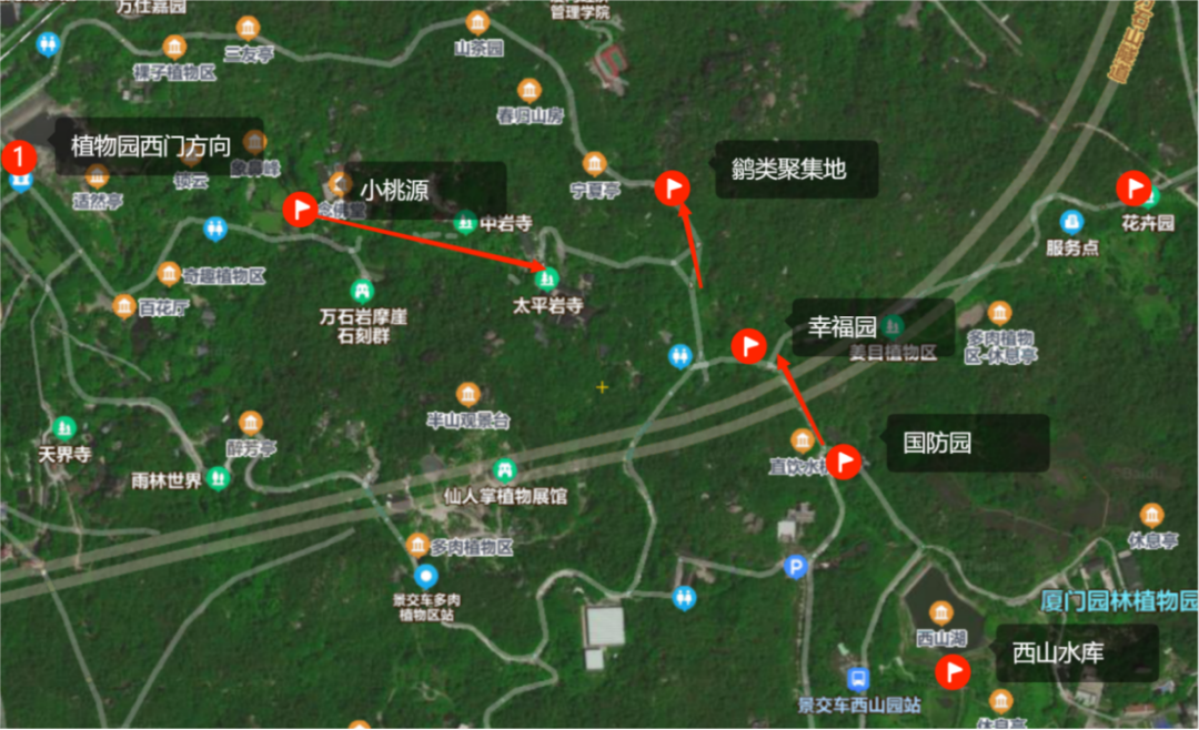 植物园面积广阔,鸟况较好的地点有太平岩寺一线,国防园至幸福园一线,花卉园,图中的鹟类聚集地一线,花卉园和西山水库。春秋的迁徙季,过境的鹟类都喜欢待在图中的三条红色箭头标识路线上,定位随机,需要仔细探索发现,更好的方法是提前打听最近几天的鸟讯。