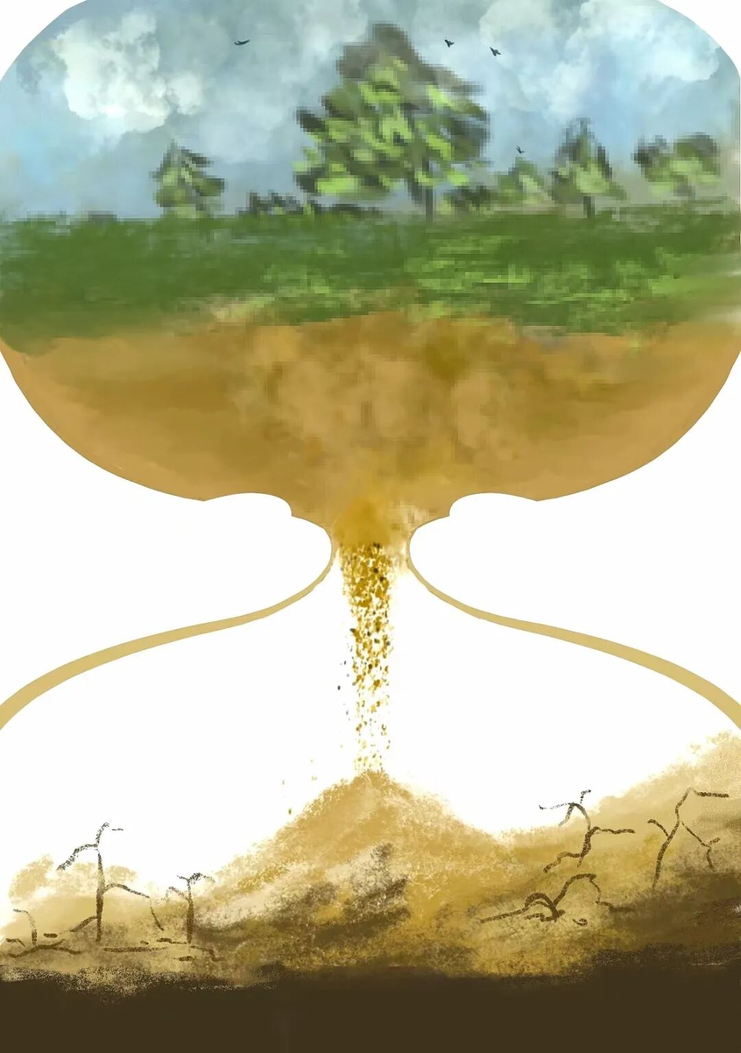 整体是个沙漏形状,意味着一些破坏环境的行为造成的水土流失与荒漠化;沙漏口很细,代表着一点点流失;沙漏下方是枯骨与沙漠,意为荒漠化,一点一滴的破坏终成灭亡之路。