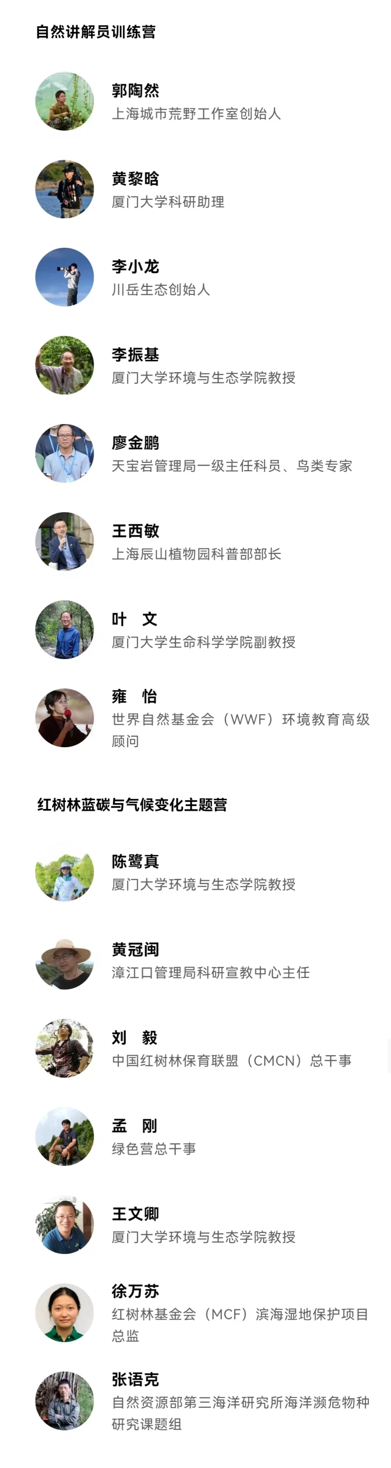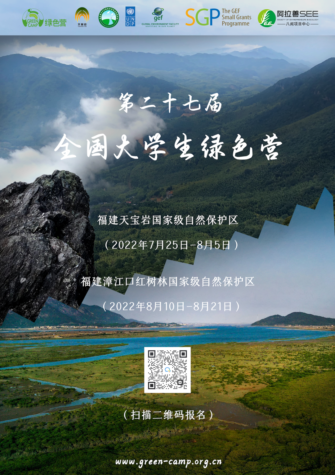 今年,第二十七届全国大学生绿色营如约而至,共两个营期,分别位于福建天宝岩国家级自然保护区与福建漳江口红树林国家级自然保护区,欢迎对自然教育及红树林蓝碳与气候变化等相关主题感兴趣的同学报名参加。